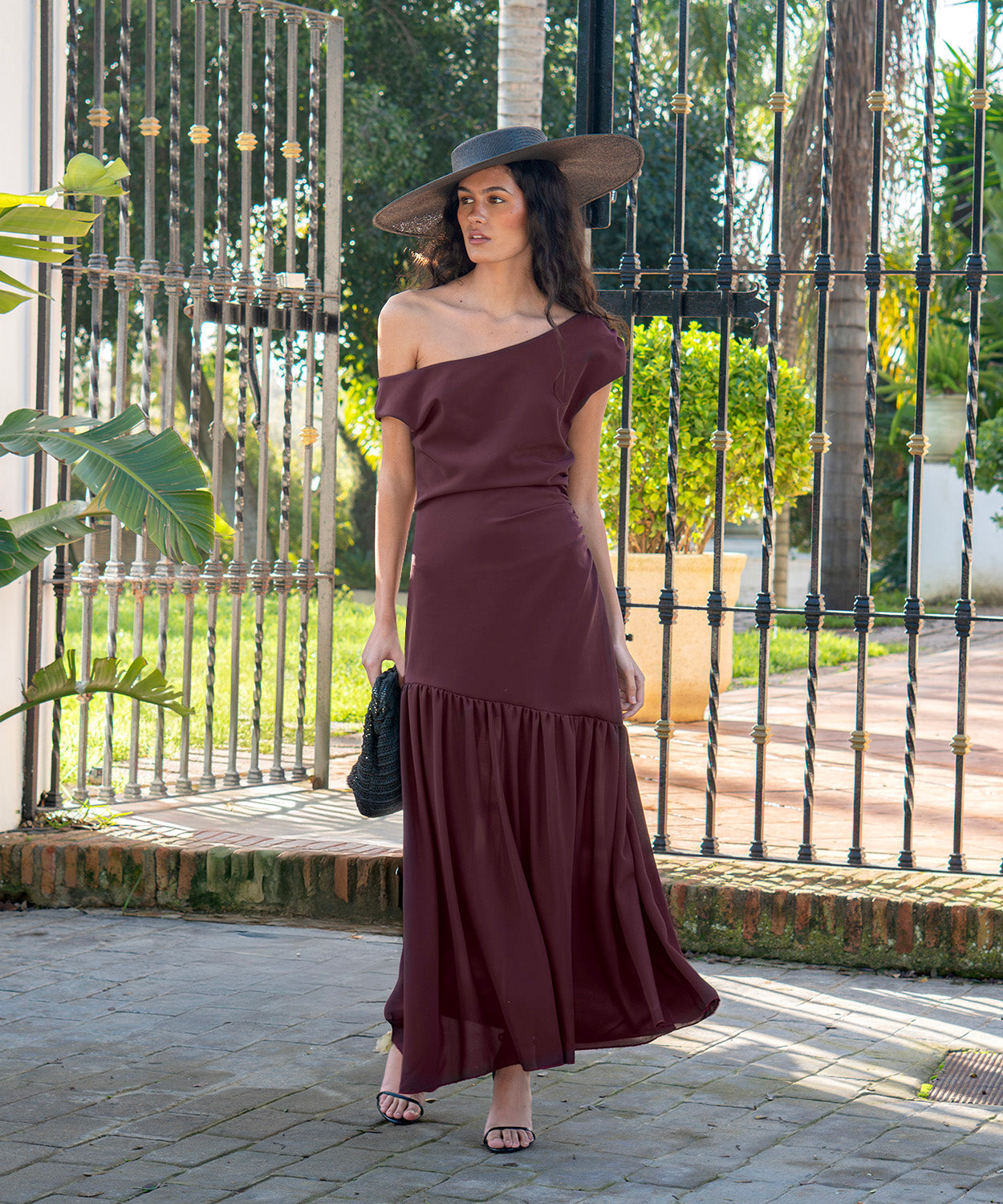 Vestido confeccionado en tejido de crepe elástico con frunce lateral y escote asimétrico con drapeado en hombro. Bajo con corte asimétrico a la altura de la cadera y falda de gasa fluida. Combinado con nuestro chocker Gala.