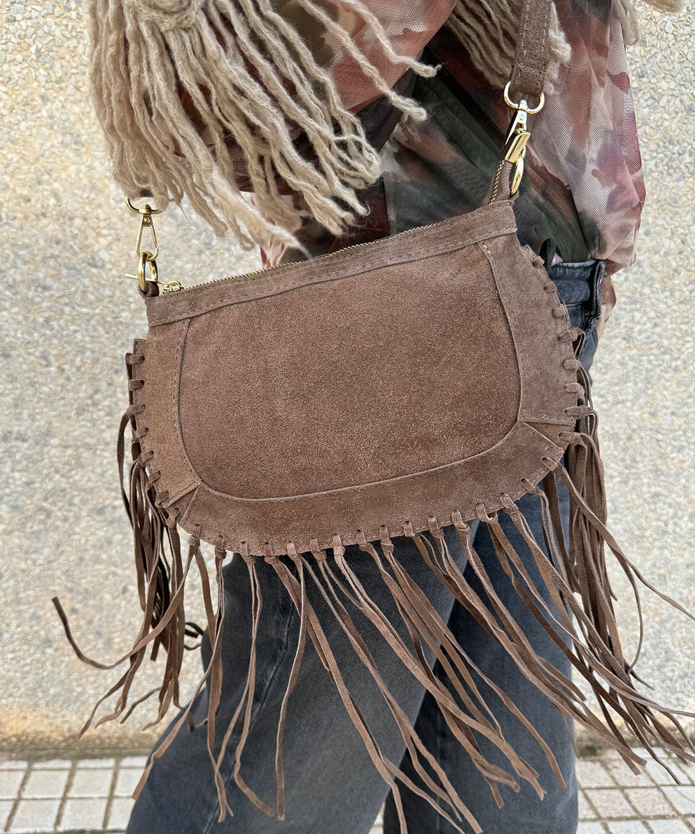 Bolso de hombro para mujer confeccionado en ante con detalle de flecos, asa de hombro y asa de cruzar extraíbles.