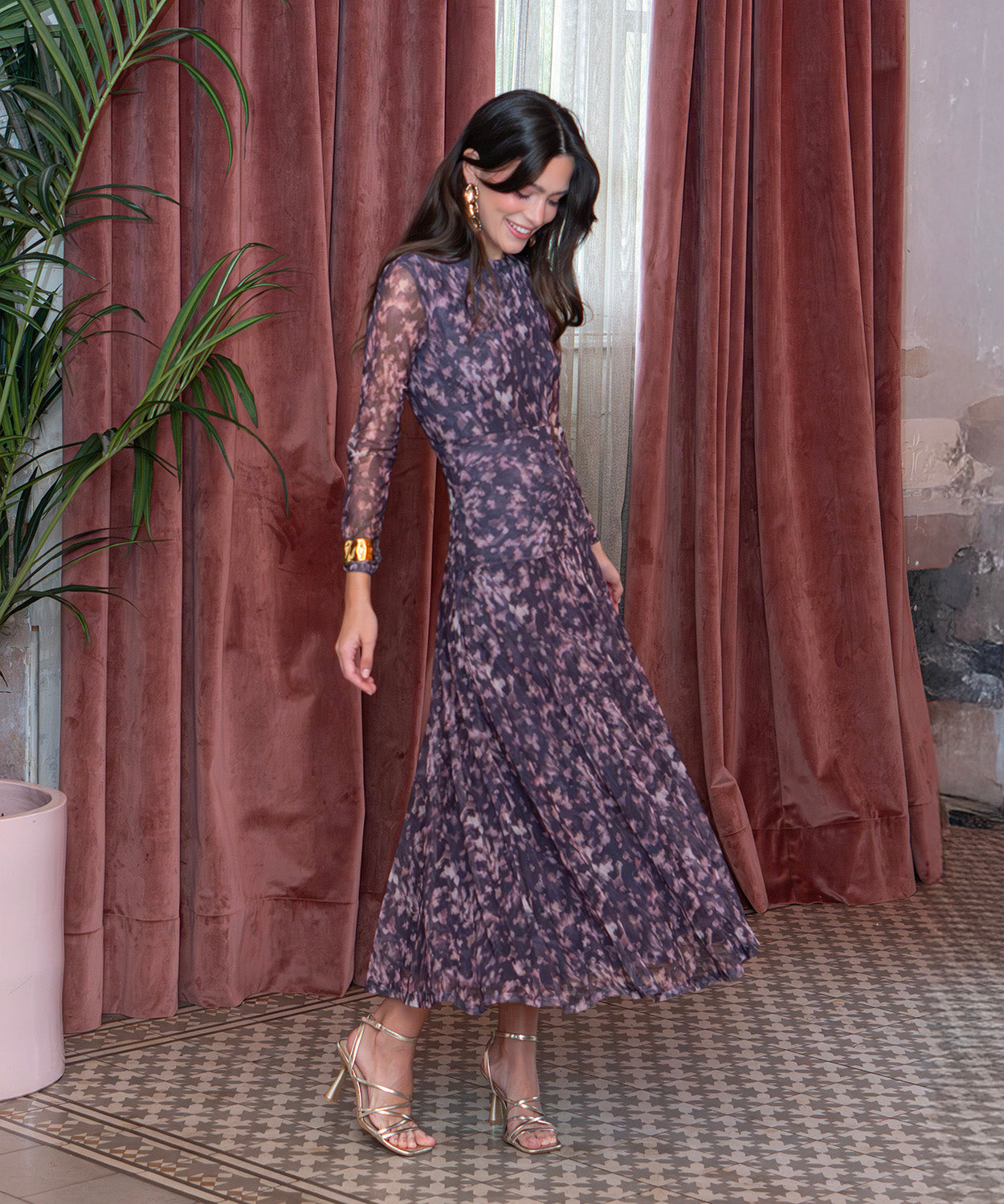 Vestido midi estampado manga larga de tul. Tiene el cuello cerrado, manga larga con transparencias y es de corte evasé con vuelo, por lo que favorece a todo tipo de siluetas.