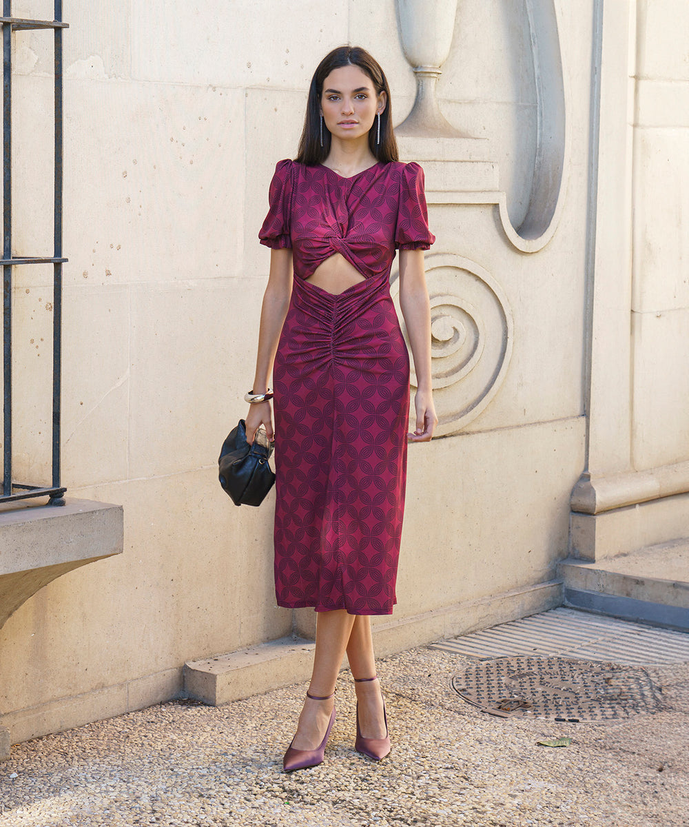 Este vestido midi en tonos azules destaca por su diseño cut out en la cintura.